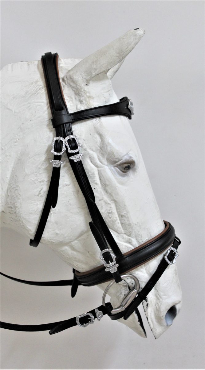 A Mix of Baroque and English this simple bridle has a comfort crown and padded simple noseband with or without the flash, The padding can be in a contrasting color. The browband is contoured for the crown emblem, Portuguese orientate buckles at the elegance.,