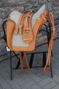 Upcharge: Elva Gaitain style chevron stitched flap and Royal stitched seat, xairel straps, brass Cortesia rings with custom brass conchos