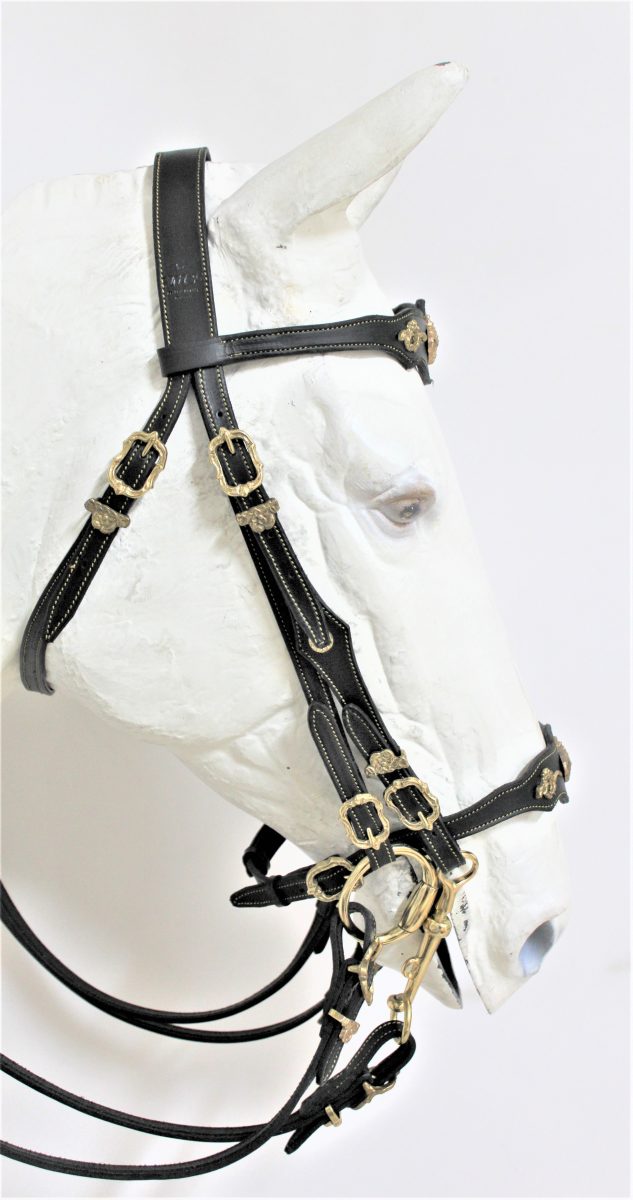 Crown Half Courtesy bridle  Crown and emblem contoured nose and browband give a very elegant and lighter design to the Cortesia bridle. A simple single rosette on each cheek piece, a simple noseband closure design. , All VMCS bridles come with smooth matching reins with buckle ends. ,