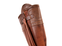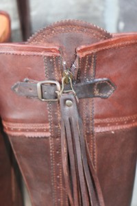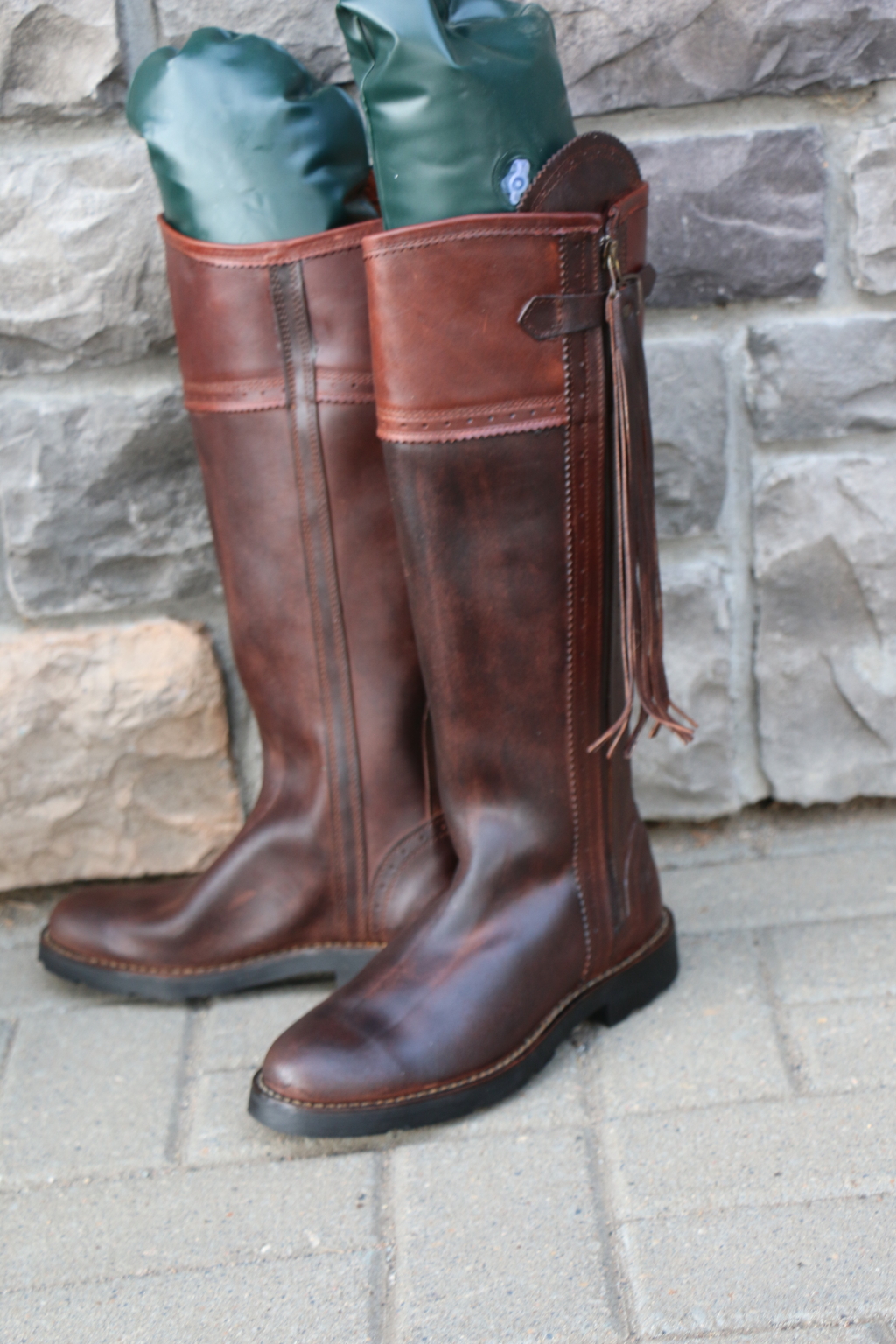 Iberic leather Espanhola style boot. Tall boots offers a walking heel with a rubber sole. Side tassel zip, with top strap and buckle. Beautifull decorated punch holes and capped heel.