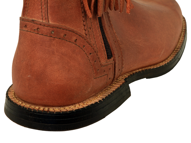 Mid-cut boot with round toe, stitched cap heel, flat walking leather sole, side zip with tassel, capped contrasting top. Buttery soft calf leather.