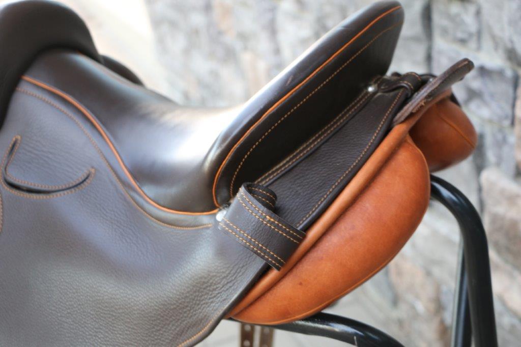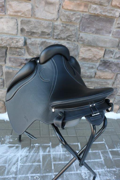 It is made from European-selected leather of box-calf and vegetal crupon. Latex rubber seat. Dressage flap. Knee pad. Dressage tree made of special material, using the latest modern technology. Safety stainless steel stirrup bars. Long girth straps. The panel made of wool. Size: Rider: Standard. Horse from 28 to 34 cm.